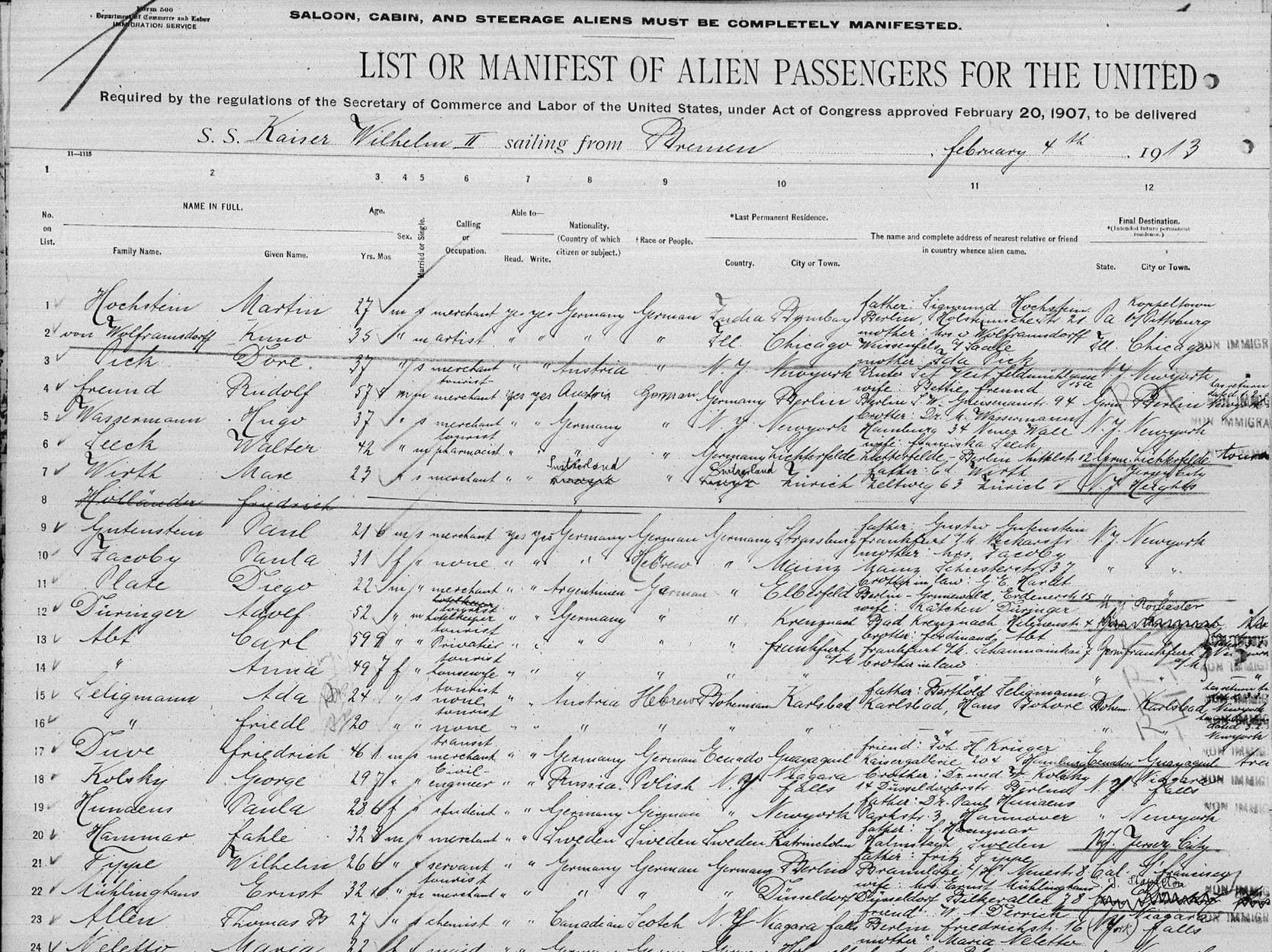 Frieda (genannt auch Friedl) Seligmann, geb. 27.2.1892 in Karlsbad, Einreise in USA am 12.2.1913, Reise mit Schwester Ada; angegebene Ankunftsadresse: Bruder Herbert Seligmann, New York, 23 Z (?), West 22th Str., Schiff: Kaiser Wilhelm aus Bremen, Einreise USA am 11.11.1914 von Rotterdam; Frieda heiratet am 20.1.1917 den am 29.12.1886 in Chicago geborenen Alfred (James) Ward. Mit diesem reist sie etwa 22.9.1929 von Hamburg nach New York ("S.S. Cleveland", Adressse: 1040 Park Avenue, New York). Er arbeitet 1942 bei "E. H. Rollins & Sons, Inc. , 44 Wall Street", beide wohnen zu dieser Zeit 4 Dartmouth St., Forest Hills, Queens, New York, zur Miete, haben keine Kinder, das Jahreseinkommen beträgt 2.862 Dollar.