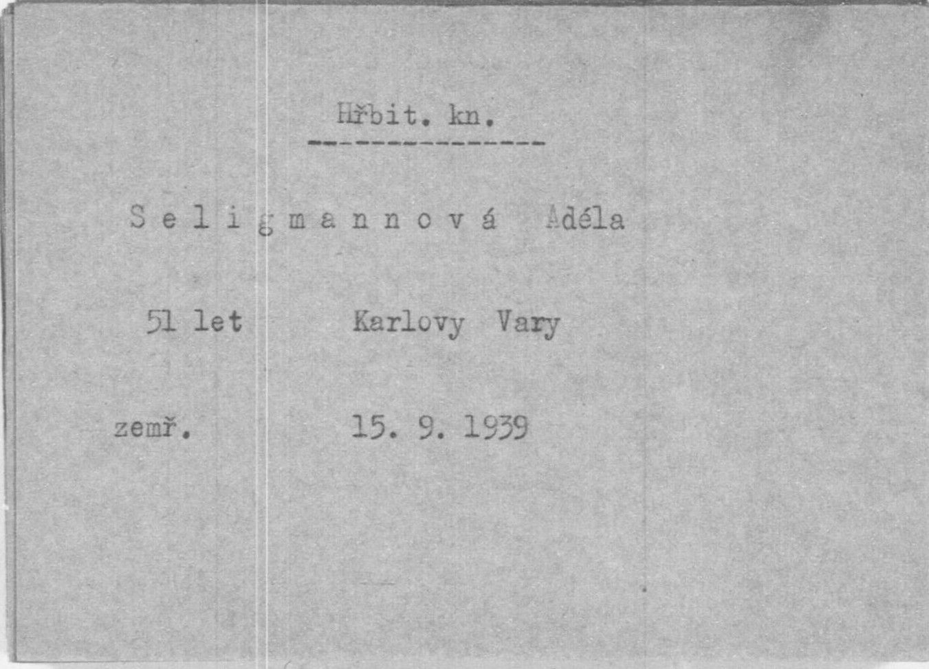 Nach einer im Karteikarte aus Theresienstadt (Quelle Arolsen Archives, Ghetto Theresienstadt-Kartei, Signatur 11422001 288) könnte Adele dort am 15.9.1939 verstorben sein. Der Text ist wohl aus dem "Friedhofsbuch" auf die Karteikarte übertragen, der Name als "Adéle Seligmannova" bezeichnet, das Alter mit 51 Jahren und als Herkunft Karlovy Vary. Eine zweite Adele Seligmann gab es dort nicht. Das macht auch plausibel, weshalb in sonstigen Datenbanken keinerlei Hinweise mehr auf Adele zu finden sind, während die übrigen Geschwister von Walter Serner in die USA ausgereist sind, wo sich immerhin noch Spuren finden.